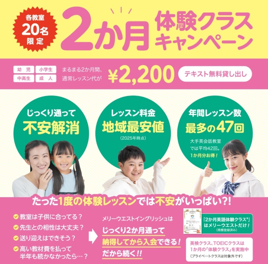しかもメリーウエストイングリッシュのレッスン料金設定は地域最安値です。(2025年時点)